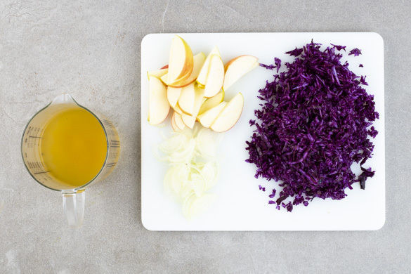 Den Rotkohl mit einer Küchenreibe grob raspeln. Den Apfel vierteln, vom Kerngehäuse befreien und in feine Scheiben schneiden. Die Zwiebel schälen, halbieren und in feine Streifen schneiden. Das Brühgewürz in 400ml heißem Wasser auflösen.