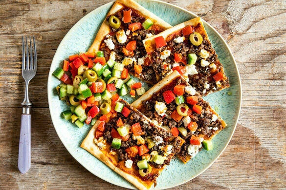 Ob Sonnenbaden auf Samos, Sightseeing in Athen oder Partymachen auf Mykonos – Griechenland hat für jeden was zu bieten! Inspiriert von wehmütigen Erinnerungen an heiße Tage und lustige Nächte landet heute diese Köstlichkeit auf deinem Teller: knuspriger Flammkuchenteig getoppt mit saftigem Rinderhack und würzigem Feta. Dazu ein Salat aus knackiger Paprika, pikanten Oliven und erfrischender Gurke. Mmmh, so schmeckt Urlaub!