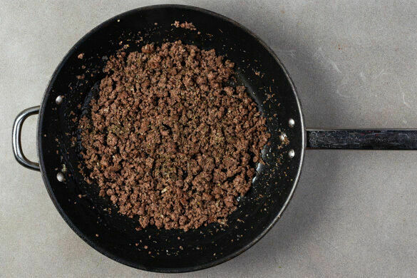 Das Hackfleisch in einer großen Pfanne mit 1EL Olivenöl bei mittlerer bis starker Hitze 3–4Min. anbraten. Den Knoblauch, die ½ des Oreganos und je ½TL Salz und Pfeffer zugeben und ca. 1Min. mitbraten, dann die Pfanne vom Herd nehmen.