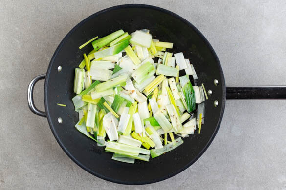 Die Zwiebeln schälen, halbieren und in feine Streifen schneiden. Den Lauch längs halbieren, dann quer in ca. 3cm große Stücke schneiden.