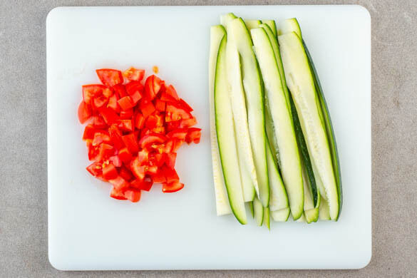 Inzwischen die Zucchini längs halbieren und jede Hälfte der Länge nach in dünne Scheiben schneiden. Die Tomaten grob würfeln.