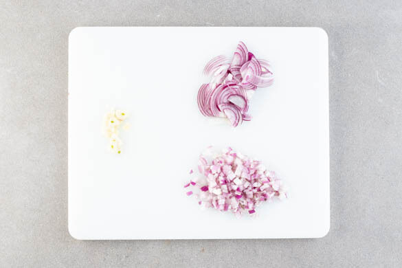 In einem kleinen Topf 300ml leicht gesalzenes Wasser für den Reis zum Kochen bringen. Die Zwiebel schälen und halbieren, eine Hälfte fein würfeln, die andere Hälfte in feine Streifen schneiden. Den Knoblauch schälen und in feine Scheibchen schneiden.