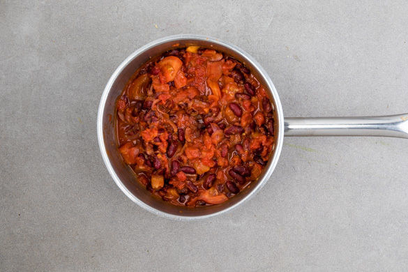 Die Zwiebelstreifen in einem mittelgroßen Topf mit 1EL Pflanzenöl bei mittlerer Hitze 2–3Min. glasig anbraten. 1–2TL geräuchertes Paprikapulver unterrühren, dann die Bohnen samt Flüssigkeit, die gehackten Tomaten und die gewürfelten Tomaten unterrühren.