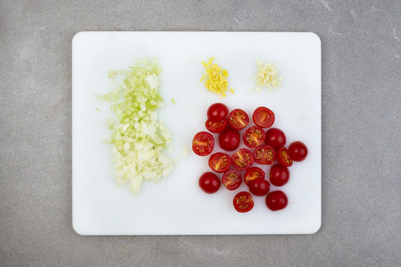 Den Backofen auf 200°C Umluft (220°C Ober-/Unterhitze) vorheizen. Die Kirschtomaten halbieren. Den Ingwer schälen und fein würfeln. Die Zwiebeln und den Knoblauch schälen und ebenfalls fein würfeln.