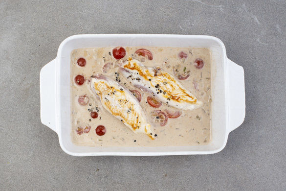 Das Fleisch mit etwas Küchenkrepp trocken tupfen, längs halbieren und in einer großen Pfanne mit 1–2EL Pflanzenöl bei starker Hitze auf jeder Seite 1–2Min. scharf anbraten. Das Fleisch aus der Pfanne nehmen, mit Salz und Pfeffer würzen und in eine Auflaufform geben. Die Sauce darübergießen und das Fleisch im Ofen 10–15Min. backen, bis es in der Mitte durchgegart ist.