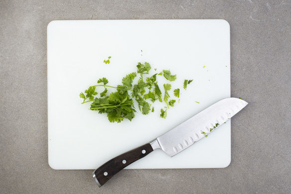 Die Korianderblätter von den Stängeln zupfen und grob schneiden. Das Hähnchen mit dem Blumenkohlreis und der Sauce anrichten und mit dem Koriander garniert servieren.