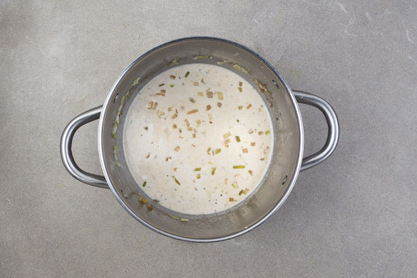 Den Ingwer, die Zwiebeln und den Knoblauch in einem mittelgroßen Topf mit 1–2EL Pflanzenöl bei mittlerer Hitze 1–2Min. glasig anschwitzen. Die Gewürzmischung sowie 1/2EL Mehl unterrühren und mit der Kokosmilch ablöschen. Die Sauce mit Salz und Pfeffer würzen und ca. 3Min. bei niedriger Hitze sanft köcheln lassen.
