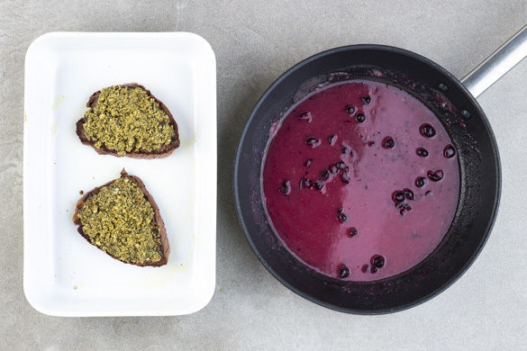 Das Fleisch in einer großen Pfanne mit 1–2EL Olivenöl bei starker Hitze auf jeder Seite ca. 1Min. scharf anbraten. In eine weitere Auflaufform geben, mit der Kürbiskernmasse bedecken und weitere 6–8Min. im Ofen garen. 1EL Butter im Bratensatz der Pfanne schmelzen, dann 2TL Mehl, die restliche Brühe und die Marmelade unterrühren und die Sauce ca. 2Min. sanft köcheln lassen.