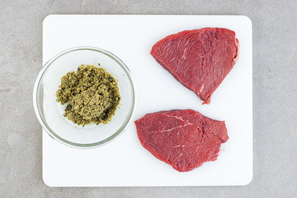 Das Fleisch mit etwas Küchenkrepp trocken tupfen, in insgesamt 4 gleich große Stücke schneiden und von beiden Seiten mit Salz und Pfeffer würzen. Die Kürbiskerne fein hacken und mit den Semmelbröseln vermengen, dann 1EL weiche Butter untermischen und mit Salz und Pfeffer würzen.