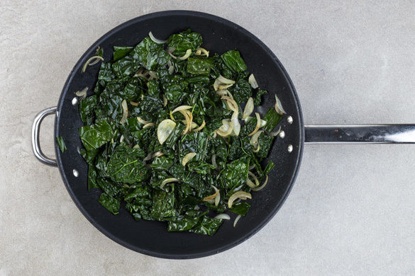 Den Schwarzkohl und die Zwiebeln in einer weiteren großen Pfanne mit 2EL Olivenöl bei mittlerer Hitze 5–6Min. braten. Das Gemüse und die Sauce mit Salz und Pfeffer würzen und mit den Steaks und dem Gratin anrichten und servieren.