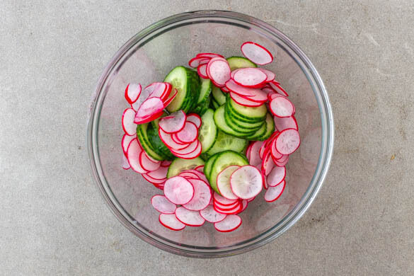 Die Gurke und die Radieschen in dünne Scheiben schneiden und vermengen.