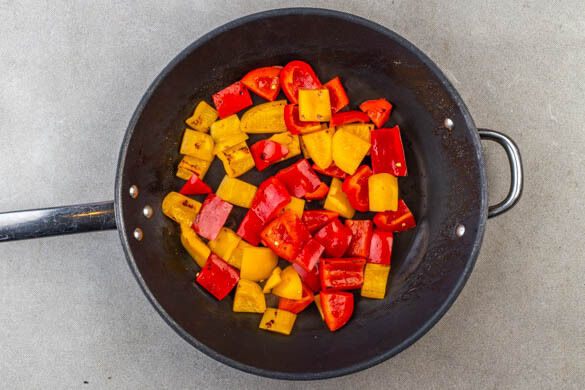 Die Paprika in einer großen Pfanne mit ½EL Olivenöl und je 1 Prise Salz und Pfeffer bei mittlerer bis starker Hitze ca. 5Min. braten, bis sie weich sind und anfangen, Blasen zu werfen. Dabei gelegentlich umrühren und die Paprikastücke mit dem Kochlöffel oder einem Pfannenwender an den Pfannenboden drücken.