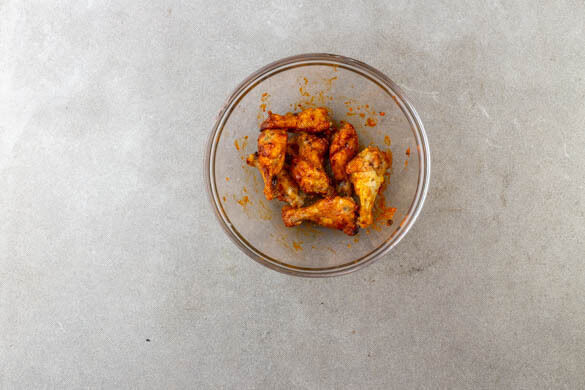 Das Fleisch gleichmäßig mit der Buffalo-Sauce überziehen. Das Fleisch mit den Pommes und dem Salat anrichten und mit der Käsesauce als Dip servieren.