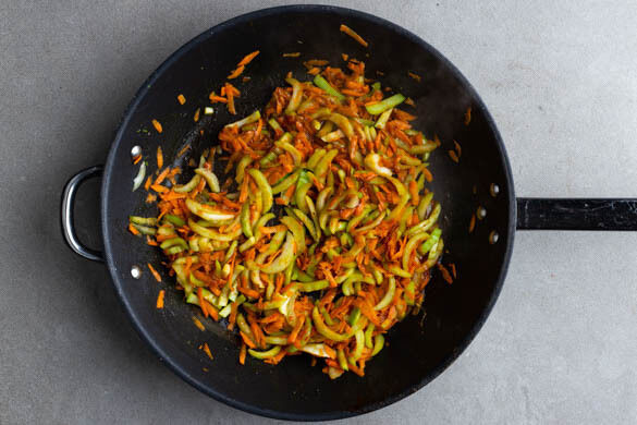 Den Knoblauch und die ½ des Currypulvers in derselben Pfanne mit 2TL Pflanzenöl bei mittlerer Hitze ca. 30Sek. anbraten. Die Karotten, die weißen Pak-Choi-Streifen und die Limettenschale zugeben und ca. 1Min. mitbraten. Mit dem Sambal Badjak und der Hoisinsauce ablöschen. Tipp: Wer es nicht so scharf mag, verwendet weniger Sambal Badjak.
