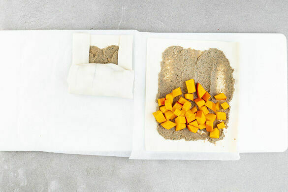 Die Teige mit dem Papier nach unten ausrollen, quer halbieren und mit der Pilzcreme bestreichen. Den Kürbis auf den jeweils unteren Seiten der Teige verteilen und mit je 1 kräftigen Prise Salz und Pfeffer würzen. Die Längsseiten der Teige nach innen über die Füllung legen. Die Teige an den Querseiten mit den Kürbiswürfeln beginnend einschlagen.