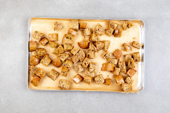 Das Brötchen in ca. 2cm große Würfel schneiden, mit 1EL Olivenöl vermengen und auf einem mit Backpapier ausgelegten Backblech verteilen. Im Ofen 4–5Min. goldbraun rösten.