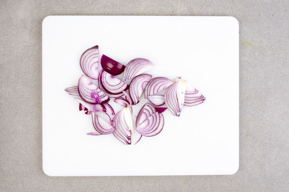Den Backofen auf 200°C Umluft vorheizen. Zwei Backbleche zum Aufwärmen mit in den Ofen geben. Die Zwiebel schälen, halbieren und in feine Streifen schneiden.