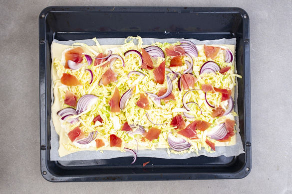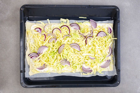 Die Flammkuchenteige mit dem Papier nach unten auf den vorgewärmten Backblechen ausrollen, mit dem restlichen Käse-Schmand bestreichen und den Wirsing und die Zwiebeln darauf verteilen. Vorsicht, die Bleche sind heiß!
