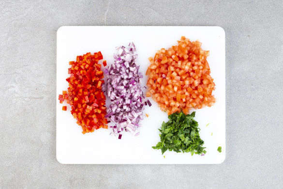 Die Paprika halbieren, entkernen und in ca. 0,5cm kleine Würfel schneiden. Die Tomaten ebenfalls in ca. 0,5cm kleine Würfel schneiden, dabei den Strunk entfernen. Die Zwiebel schälen, halbieren und fein würfeln. Die Petersilie samt Stängeln fein hacken.