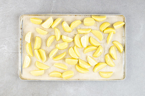 Den Backofen auf 220°C Umluft (240°C Ober-/Unterhitze) vorheizen. Die Kartoffeln schälen, halbieren und in ca. 1cm breite Spalten schneiden. Auf einem mit Backpapier belegten Backblech mit 2–3EL Olivenöl sowie Salz und Pfeffer vermengen und 25–30Min. im Ofen backen. Nach der Hälfte der Zeit einmal wenden.