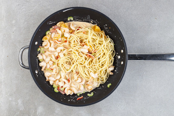Die Garnelen in einer großen Pfanne mit 1EL Olivenöl bei mittlerer bis starker Hitze 1–2Min. anbraten. Die Tomaten und den Sellerie dazugeben und die Sauce unterrühren. Die Pfanne vom Herd nehmen und die Pasta und die Mandarinen untermengen. Die Pasta mit Salz und Pfeffer abschmecken und mit den Lauchzwiebeln garniert servieren.