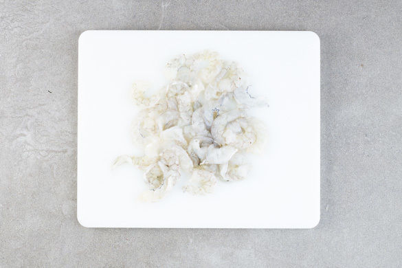 In einem großen Topf ausreichend gesalzenes Wasser für die Pasta zum Kochen bringen. Die Garnelen in einem Sieb mit kaltem Wasser abspülen, längs halbieren und trocken tupfen.