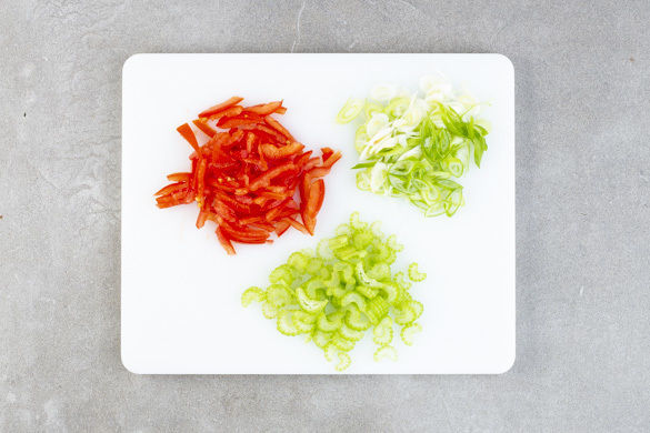 Die Tomaten vierteln, vom Kerngehäuse befreien und in dünne Streifen schneiden. Den Stangensellerie in dünne Scheiben schneiden. Die Lauchzwiebel schräg in feine Ringe schneiden.