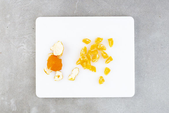 Die Mandarine schälen und die einzelnen Segmente voneinander lösen, dabei so gut es geht die weißen Fäden entfernen. Die Segmente halbieren.