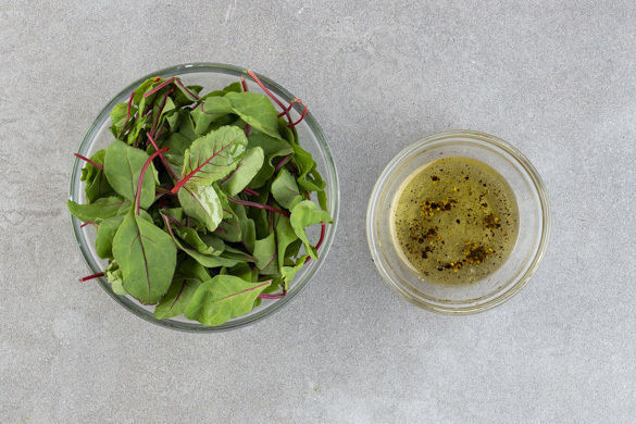 Aus 1–2EL Olivenöl, 2EL Essig, 1–2EL Wasser, 1 Prise Zucker, 1/2TL Salz und Pfeffer ein Dressing anrühren und mit dem Mangold vermengen. Den gefüllten Kürbis mit der Sauce und dem Salat anrichten, mit der Petersilie garnieren und servieren.