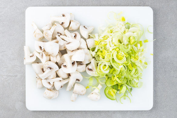 In einem großen Topf ausreichend gesalzenes Wasser für die Pasta zum Kochen bringen. Die Pilze ggf. säubern und je nach Größe halbieren oder vierteln. Den Lauch der Länge nach halbieren und quer in feine Streifen schneiden.