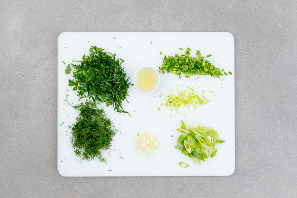 Den Schnittlauch in feine Röllchen schneiden. Die Petersilienblätter abzupfen und fein hacken. Die Dillspitzen von den Stängeln zupfen und grob schneiden. Die Limettenschale abreiben, dann die Limette halbieren und auspressen. Die Lauchzwiebeln schräg in feine Ringe schneiden. Den Knoblauch schälen und fein würfeln.