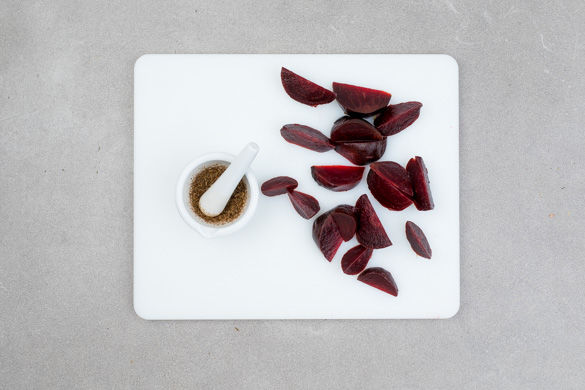 Den Kümmel in einer großen Pfanne ohne Zugabe von Fett bei mittlerer Hitze ca. 1Min. anrösten. Aus der Pfanne nehmen und abkühlen lassen, dann den Kümmel mit den Fingern oder einem Mörser grob zerreiben. Die Rote Bete in ca. 2cm breite Spalten schneiden. Dabei am besten Handschuhe und Schürze tragen.