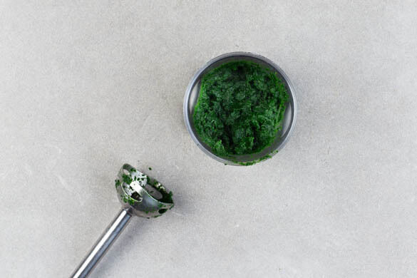Den Backofen auf 200°C (180°C Umluft) vorheizen. Den Spinat mit 4EL Wasser in einem großen Topf bei starker Hitze kochen, bis er zusammenfällt, dabei gelegentlich umrühren. In einem hohen Gefäß mit einem Stabmixer fein pürieren und auskühlen lassen.