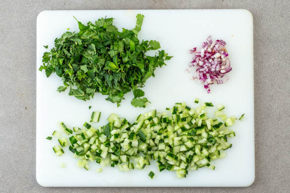 Inzwischen die übrige Zwiebelhälfte fein würfeln. Die Minzeblätter von den Stängeln zupfen und grob schneiden. Den Koriander samt Stängeln grob schneiden. Die Gurke längs halbieren, die Kerne mit einem Löffel entfernen und die Gurke in ca. 0,5cm kleine Würfel schneiden.