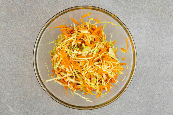 In einem mittelgroßen Topf 600ml leicht gesalzenes Wasser für den Reis zum Kochen bringen. Die Limetten halbieren, auspressen und den Limettensaft mit dem Currypulver, 4EL hellem Essig, 2EL Zucker und ½TL Salz verrühren. Die Karotte ggf. schälen, grob reiben und mit dem Weißkohl vermengen. Den Einlegesud zugeben und einmassieren.