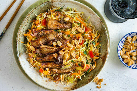 Fällt das Wort „Reissalat“, erinnert sich so mancher an die mit Mayo und Mandarinen gespickte Kuriosität, die in den 80ern auf keiner Party fehlen durfte. Doch keine Sorge: Unsere Version mit Vollkornreis, frischer Minze, knackigen Erdnüssen und in säuerlichem Limettensaft eingelegtem Kohl liegt nicht mal halb so schwer im Magen. Dazu gibt’s zartes Bio-Rindergeschnetzeltes und einen Hauch von Nostalgie. Schön!