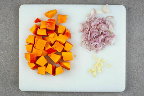 Die Kürbisse halbieren, die Kerne mit einem Löffel auskratzen und das Fruchtfleisch in 2–3cm große Würfel schneiden. Die Schalotten schälen, halbieren und in dünne Streifen schneiden. Den Knoblauch schälen und grob würfeln. In einem großen Topf ausreichend gesalzenes Wasser für die Pasta zum Kochen bringen.