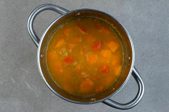 Die Schalotten, den Knoblauch und den Kürbis mit 2EL Olivenöl in einem großen Topf bei mittlerer bis starker Hitze 5–6Min. anbraten, dabei regelmäßig umrühren. 500ml Wasser angießen und das Brühgewürz einrühren. Die Brühe zum Kochen bringen und bei mittlerer bis niedriger Hitze 6–8Min. köcheln lassen, bis der Kürbis weich ist.