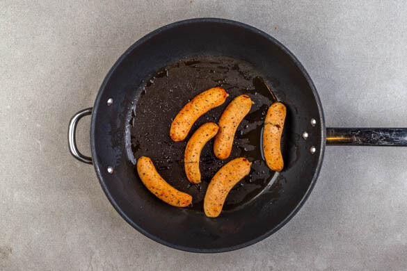 Die Würste längs halbieren und in einer großen Pfanne mit 2EL Olivenöl bei mittlerer Hitze 5–6Min. braten, bis sie durchgewärmt und appetitlich gebräunt sind. Aus der Pfanne nehmen und abgedeckt beiseitestellen, die Pfanne wird weiterverwendet.