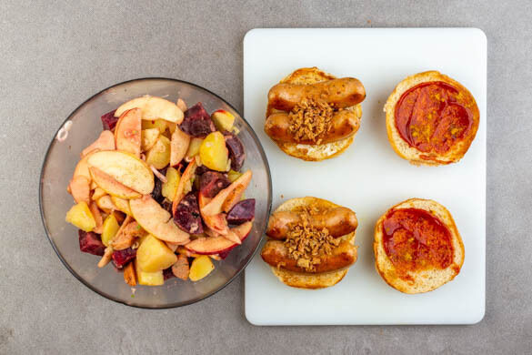 Wer kennt sie nicht, die schnelle Wurst im Brot, die im richtigen Moment ein Drei-Sterne-Menü problemlos ersetzen kann? Wir präsentieren heute unsere ureigene Sterneversion des schnellen Snacks: Es gibt saftige Geflügelwurst, kross gebraten und mit Röstzwiebeln und einem Hauch Curry zwischen fluffigen Burgerbrötchenhälften geparkt, dazu einen fruchtig-deftigen Salat mit Apfel, Roter Bete, Kartoffeln und Lauchzwiebel. Fertig!