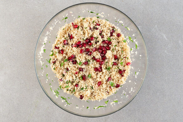 Den Granatapfel halbieren, über einer mit Wasser gefüllten Schüssel aufbrechen und die Kerne unter Wasser auslösen. Das Pulen im Wasser verhindert, dass sich Saft in der Küche verteilt. Die schwimmenden Häutchen mit einem Löffel abschöpfen, die Kerne in ein Sieb abgießen. ⅔ der Kerne, die Petersilie, 1EL Zitronensaft und 1EL Olivenöl unter den Couscous mengen.