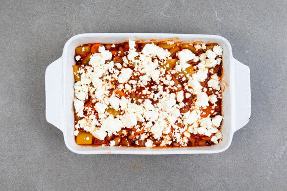 Den Eintopf in eine Auflaufform umfüllen, gleichmäßig mit dem Greek White bestreuen und ca. 10Min. im Ofen überbacken.