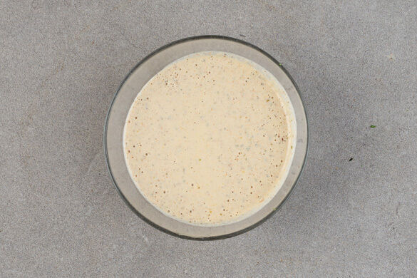 Die Walnüsse in einer mittelgroßen Pfanne ohne Zugabe von Fett bei mittlerer Hitze 1–2Min. anrösten. Zum Abkühlen aus der Pfanne nehmen und beiseitestellen. Die ½ der Walnüsse mit dem Knoblauch, der ½ des Greek White, der Gewürzmischung, 2EL Zitronensaft, 4EL Olivenöl, 80ml Wasser und ½TL Salz in einem hohen Gefäß mit einem Stabmixer fein pürieren.