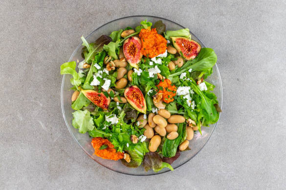 Für das heutige Gericht haben wir uns von einem traditionellen georgischen Bohneneintopf inspirieren lassen. Da dergleichen aber vielleicht nicht so ganz das Richtige ist, wenn draußen bestes Sommerwetter herrscht, haben wir ein wenig getrickst und stattdessen einen frischen Salat daraus gemacht. Tja, gewusst wie: Mit frischem Greek White, fruchtigen Feigen und einer aromatischen Creme aus Paprika und Walnüssen wird’s perfekt!