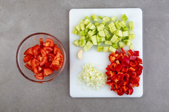 Die Tomaten grob würfeln. Die Gurken schälen und ebenfalls grob würfeln. Die Paprika vierteln entkernen und grob würfeln. Die Zwiebel schälen, halbieren und grob würfeln. Den Knoblauch schälen.