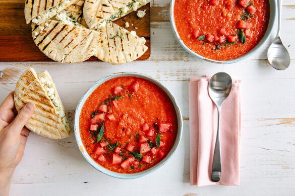 Gazpacho, die kalte Tomatensuppe aus Spanien, kennst du bestimmt schon, aber hättest du gedacht, dass man sie auch aus Wassermelonen zubereiten kann? Wir nicht! Als unsere Köchin Elisabeth dann diese kulinarische Überraschung servierte, waren wir begeistert. Die Kombi aus Melone, Gurke, Paprika und Knoblauch ist mega lecker, vor allem, wenn du sie mit warmen Pitas kombinierst, die mit Greek White gefüllt sind. Yummy!