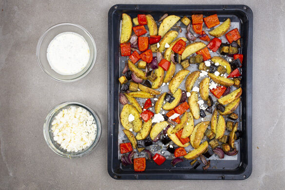 Den Backofen auf 230°C (210°C Umluft) vorheizen. Die Kartoffeln samt Schale in 1–2cm breite Spalten schneiden. Die Aubergine längs halbieren und in 1–2cm große Würfel schneiden. Die Kartoffeln und die Auberginenwürfel auf einem mit Backpapier ausgelegten Backblech mit 1EL Olivenöl, ½TL Salz und 1 Prise Pfeffer vermengen und 10–15Min. im Ofen vorbacken.