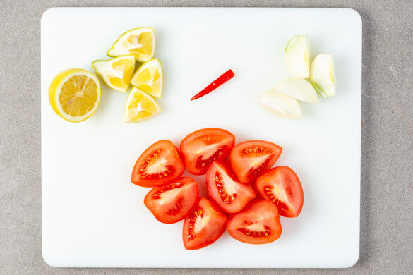 Die Tomaten vierteln. Die Zwiebeln schälen und ebenfalls vierteln. Die Stiele der Chilischoten entfernen. Tipp: Falls gewünscht, für weniger Schärfe auch die Kerne entfernen. Die Zitrone halbieren, eine Hälfte in Spalten schneiden.