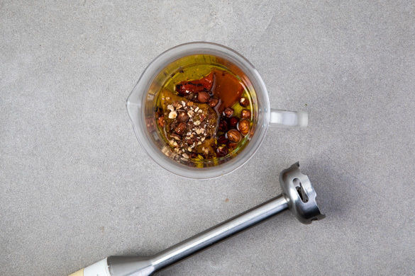 Die Paprika und die Haselnüsse in einem hohen Gefäß mit 2TL Olivenöl, 2EL Essig und 1EL Wasser fein pürieren. Mit Salz, Pfeffer und 1 Prise Zucker abschmecken. Die Petersilienblätter abzupfen, ca. ¾ der Blätter fein, die restlichen Blätter grob hacken. Die fein gehackte Petersilie mit 1EL Olivenöl, 1EL Essig, 1EL Wasser sowie je 1 kräftigen Prise Salz und Pfeffer verrühren.