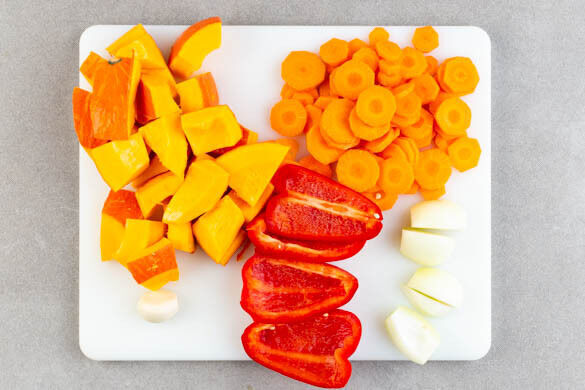 Den Backofen auf 240°C (220°C Umluft) vorheizen. Die Kürbisse halbieren, die Kerne mit einem Löffel herausschaben und die Kürbisse in 3–4cm große Stücke schneiden. Die Karotten ggf. schälen und in dünne Scheiben schneiden. Die Paprika vierteln und entkernen. Die Zwiebeln schälen und vierteln. Den Knoblauch schälen.